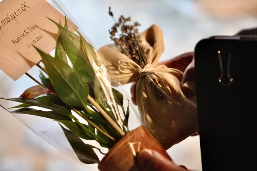 Ιδιαίτερες ήταν και οι μπομπονιέρες που μοιράστηκαν στον γάμο και έγραφαν: «Ευχαριστούμε πολύ. Κωστής και Τόνια, 11/10/2021».