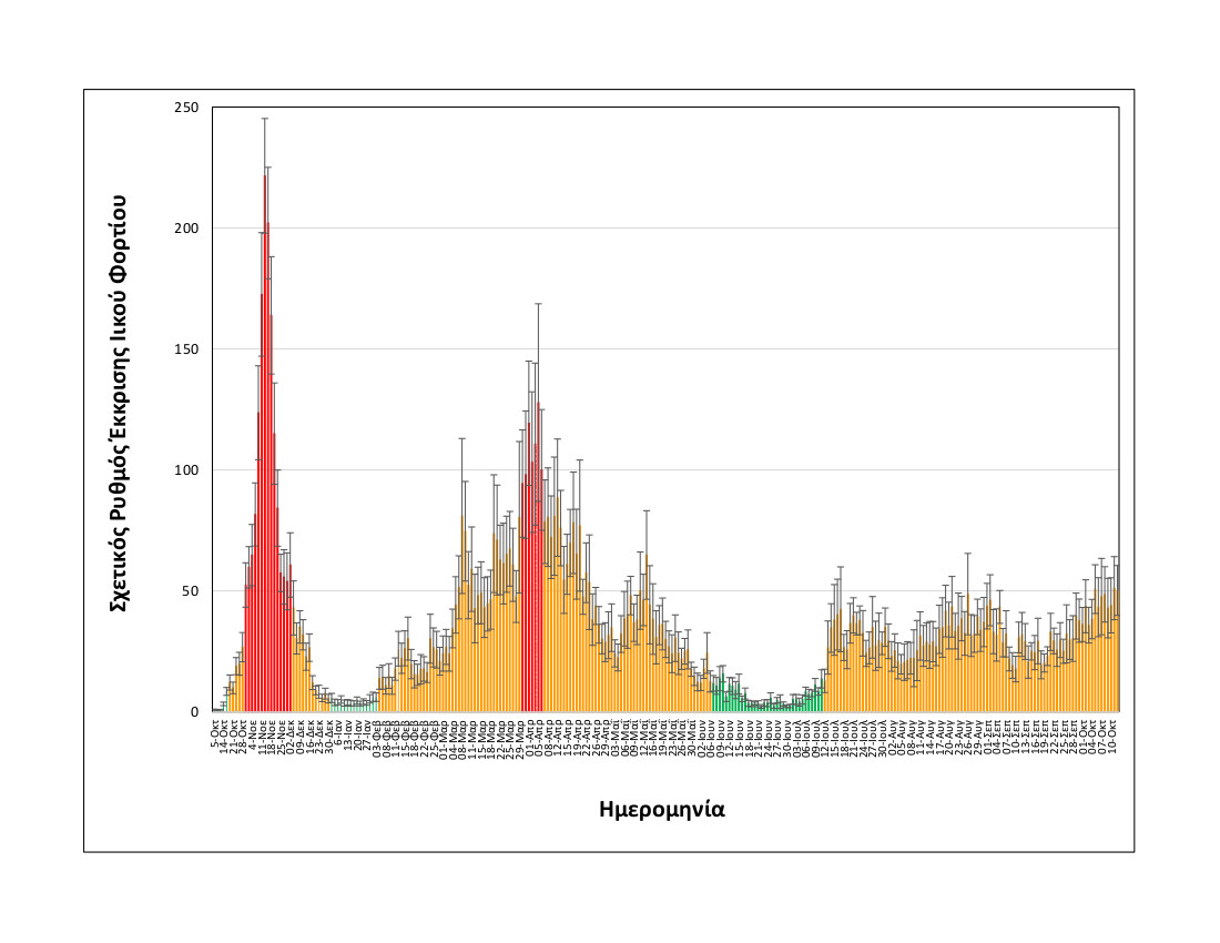 Οριακά αυξημένη (+17%) σε σχέση με τη μέση τιμή των δύο αμέσως προηγούμενων μετρήσεων του Σαββάτου 09/10 και της Κυριακής 10/10. Οριακά αυξημένη (+14%) σε σχέση με την μέση τιμή της προηγούμενης Δευτέρας 04/10 και Τρίτης 05/10.