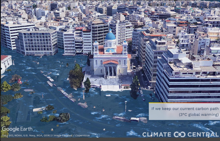 Δείτε πόσο απειλούνται ελληνικές παραθαλάσσιες πόλεις, όπως ο Πειραιάς και η Θεσσαλονίκη, από την κλιματική αλλαγή.