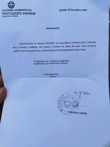 Στην απόφαση, μάλιστα, αναφερόταν πως, από την αναστολή εργασιών «εξαιρούνται οι υποθέσεις που αφορούν αυτόφωρα κακουργήματα και πλημμελήματα, καθώς επίσης και οι υποθέσεις που χρήζουν άμεσου χειρισμού λόγω επείγοντος χαρακτήρα».