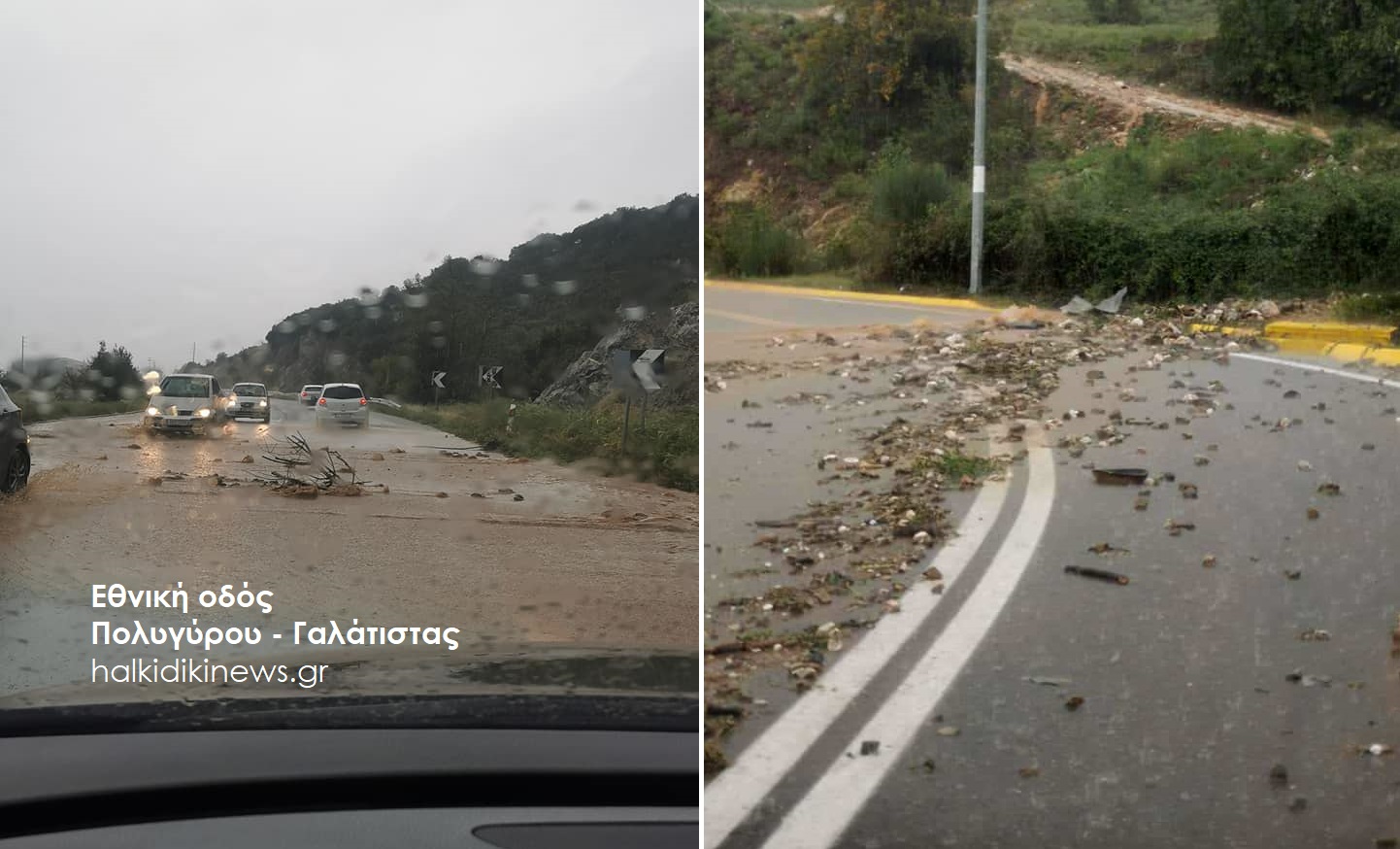 Φερτά υλικά από το βουνό κατέβασαν τα νερά της βροχής στην εθνική οδό, λίγο πριν τον πρώτο κόμβο στην είσοδο της Γαλάτιστας από Πολύγυρο.