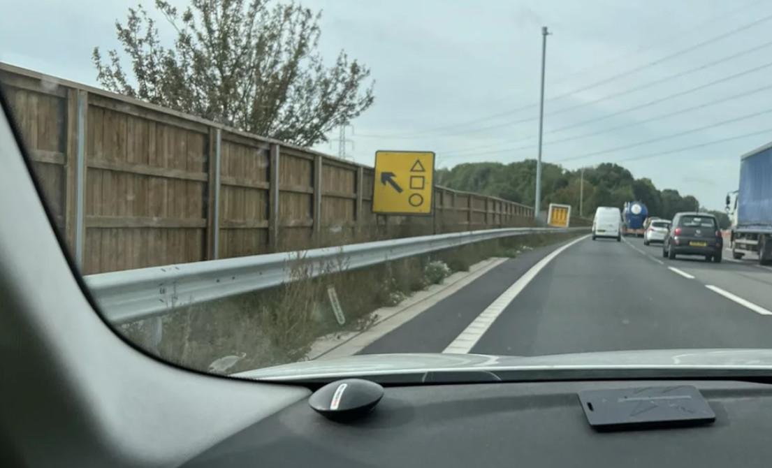 Οι διερχόμενοι οδηγοί βλέπουν ένα τρίγωνο, ένα τετράγωνο και έναν κύκλο μαζί με ένα βέλος που υποδεικνύει την επόμενη έξοδο.