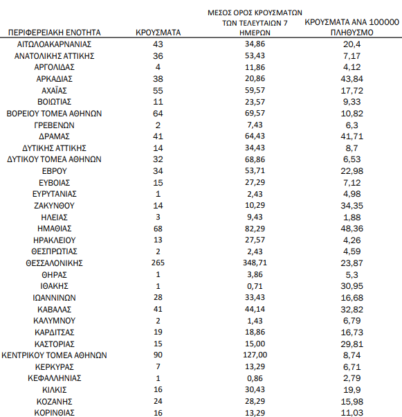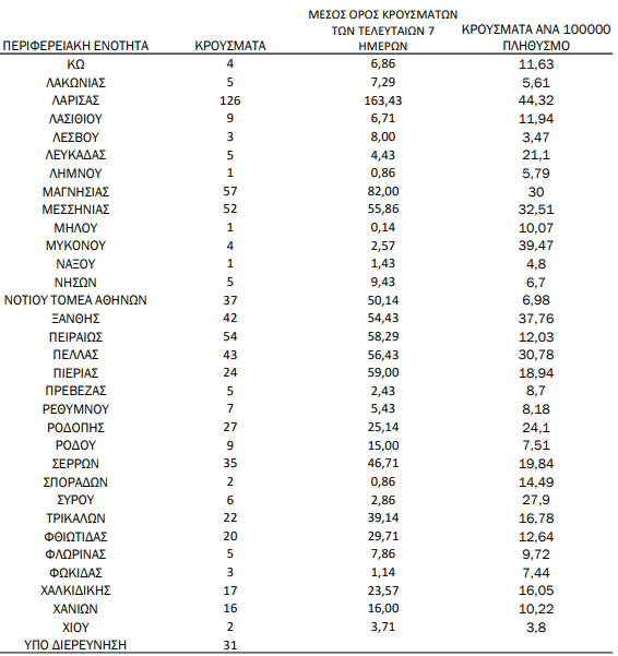 Ακόμα, 126 κρούσματα καταγράφει η Λάρισα, 68 η Ημαθία, 57 η Μαγνησία, 55 η Αχαΐα και 52 η Μεσσηνία.