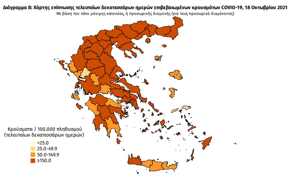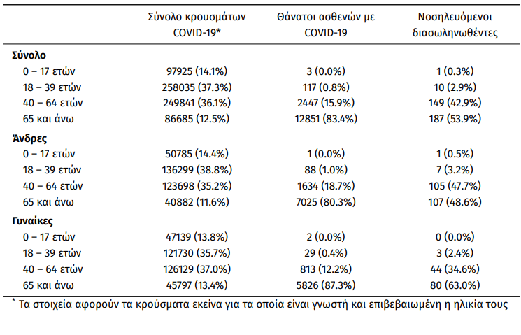 Οι νέοι θάνατοι ασθενών με COVID-19 είναι 43, ενώ από την έναρξη της επιδημίας έχουν καταγραφεί συνολικά 15.418 θάνατοι. Το 95.3% είχε υποκείμενο νόσημα ή/και ηλικία 70 ετών και άνω.
