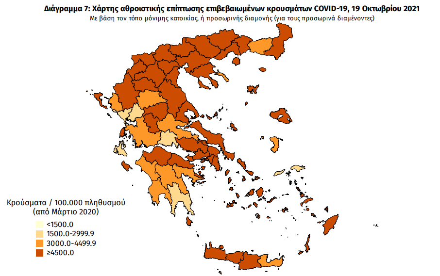 Ο χάρτης αποτυπώνει τη γεωγραφική κατανομή των συνολικών κρουσμάτων COVID-19 (από την αρχή της επιδημίας) ανά Περιφερειακή Ενότητα της χώρας, με βάση την δηλωθείσα διεύθυνση μόνιμης κατοικίας του ασθενούς, ή τη διεύθυνση προσωρινής διαμονής για τους τουρίστες και άλλους προσωρινά διαμένοντες στην Ελλάδα. Συμπεριλαμβάνονται τόσο κρούσματα με ιστορικό ταξιδίου (“εισαγόμενα”) όσο και κρούσματα με πιθανή εγχώρια μετάδοση.