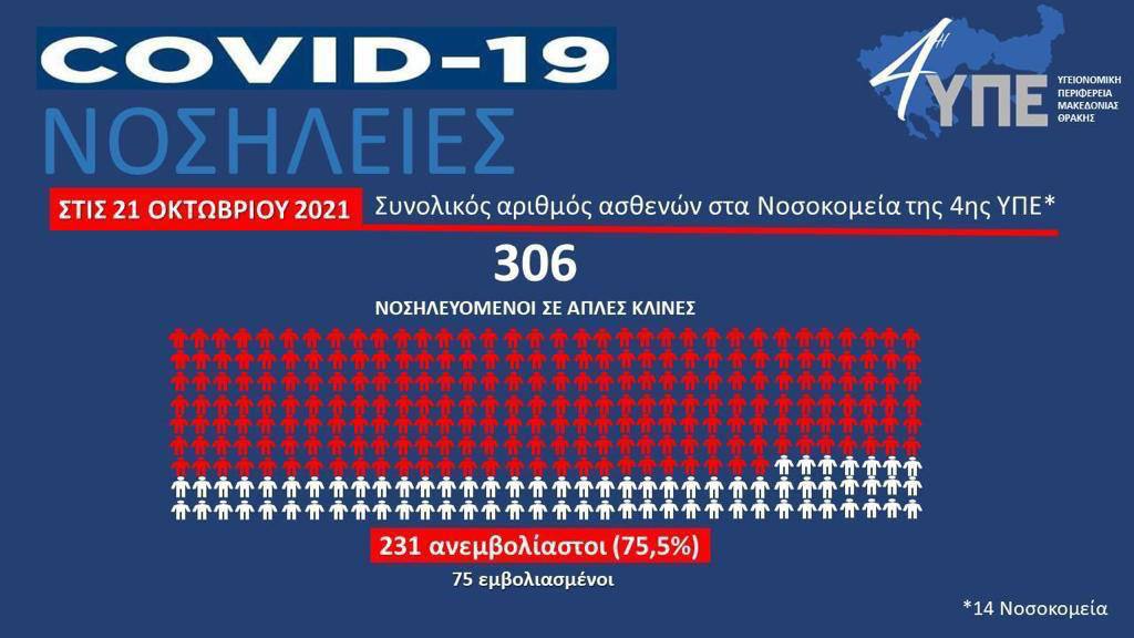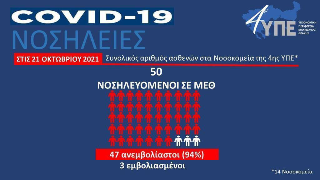 Παρόμοια κατάσταση στην 4η ΥΠΕ, όπου από τους 50 νοσηλευόμενους σε ΜΕΘ οι 47 είναι ανεμβολίαστοι και μόλις 3 εμβολιασμένοι.