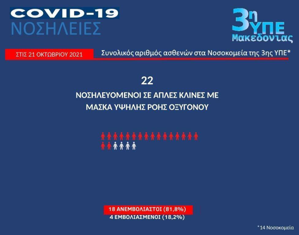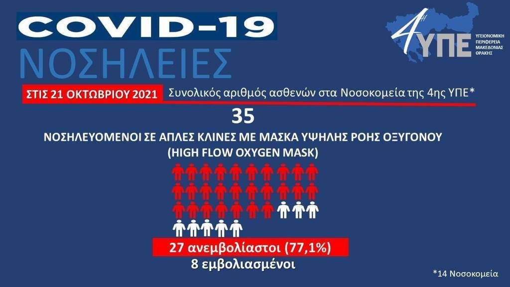 Ακόμα, στην 3η ΥΠΕ 22 συνάνθρωποί μας βρίσκονται νοσηλευόμενοι σε απλές κλίνες με μάσκα υψηλής ροής οξυγόνου, εκ των οποίων 18 είναι ανεμβολίαστοι και μόλις 4 εμβολιασμένοι, τη στιγμή που στην 4η ΥΠΕ 35 άνθρωποι νοσηλεύονται σε απλές κλίνες με μάσκα υψηλής ροής οξυγόνου, όπου οι 27 είναι ανεμβολίαστοι και 8 εμβολιασμένοι.