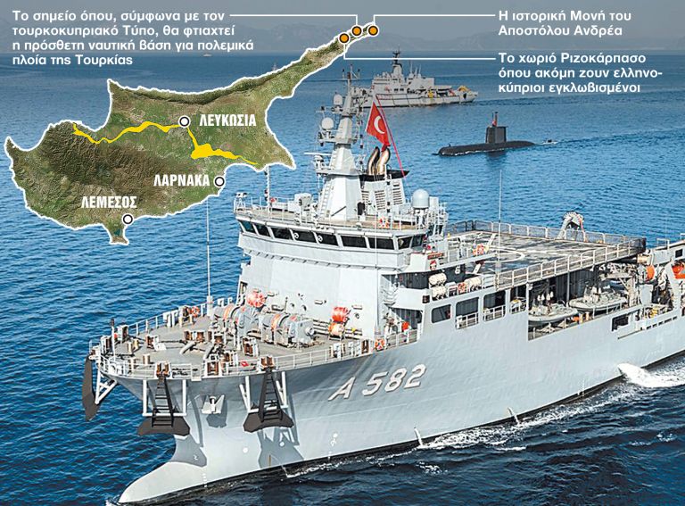 Αυτό όμως δεν είναι το μοναδικό που καταγράφεται. Ο τουρκοκυπριακός Τύπος δημοσίευσε χθες πληροφορίες με βάση τις οποίες πέρα από τη στρατιωτική βάση για πολεμικά drones στο κατεχόμενο Λευκόνοικο και τη σχεδιαζόμενη ναυτική βάση στο Μπογάζι στο μέσον του κόλπου της Αμμοχώστου για τις οποίες επίσης είχαμε γράψει προ ημερών, ελήφθη και πρόσθετη απόφαση για τρίτη ναυτική βάση στο Ακρωτήρι της Μονής του Αποστόλου Ανδρέα στο ανατολικότερο άκρο της Κύπρου, στην Καρπασία.