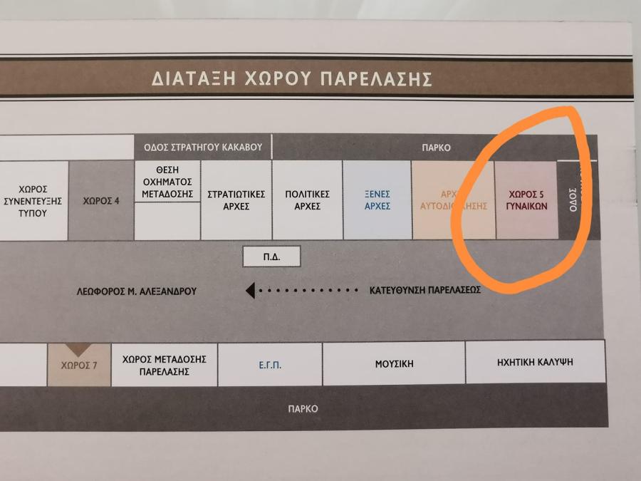 Πού είναι το πρόβλημα; Στη φωτογραφία, απεικονίζεται το διάγραμμα των θέσεων, προκειμένου οι προσκεκλημένοι να γνωρίζουν πού θα καθίσουν. Και μαζί με τους αναμενόμενους διαχωρισμούς, όπως «πολιτικές αρχές», «ξένες αρχές», «στρατιωτικές αρχές», εμφανίζεται και το πιο απροσδόκητο – αλλά ιδιαιτέρως εύγλωττο – «χώρος γυναικών».
