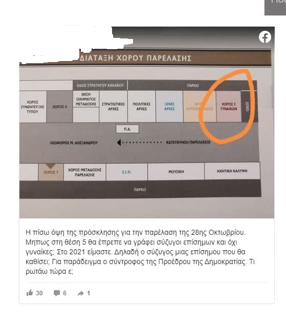 «Η πίσω όψη της πρόσκλησης για την παρέλαση της 28ης Οκτωβρίου. Μηπως στη θέση 5 θα έπρεπε να γράφει σύζυγοι επίσημων και όχι γυναίκες; Στο 2021 είμαστε. Δηλαδή ο σύζυγος μιας επίσημου που θα καθίσει; Για παράδειγμα ο σύντροφος της Προέδρου της Δημοκρατίας. Τι ρωτάω τώρα ε;».