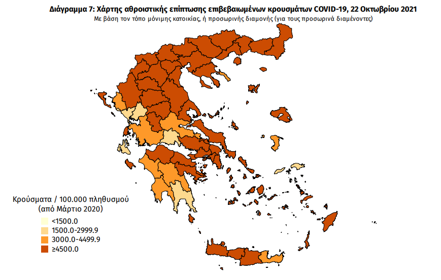 Ο χάρτης αποτυπώνει τη γεωγραφική κατανομή των συνολικών κρουσμάτων COVID-19 (από την αρχή της επιδημίας) ανά Περιφερειακή Ενότητα της χώρας, με βάση την δηλωθείσα διεύθυνση μόνιμης κατοικίας του ασθενούς, ή τη διεύθυνση προσωρινής διαμονής για τους τουρίστες και άλλους προσωρινά διαμένοντες στην Ελλάδα. Συμπεριλαμβάνονται τόσο κρούσματα με ιστορικό ταξιδίου (“εισαγόμενα”) όσο και κρούσματα με πιθανή εγχώρια μετάδοση.