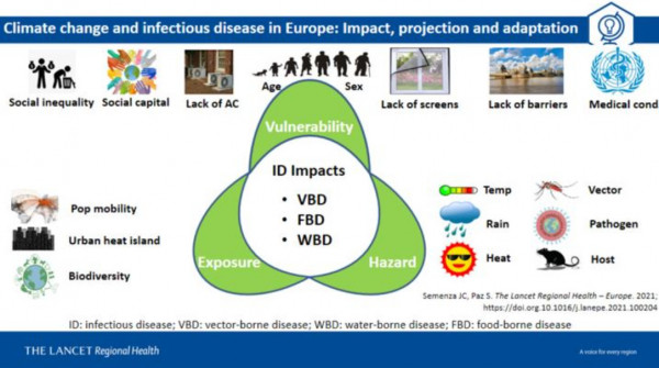 Οι λοιμώδεις νόσοι προκαλούνται είτε από κάποιον φορέα (ζώο, έντομο), από το νερό ή τα τρόφιμα, με τον κίνδυνο ευνοϊκής μετάδοσης του παθογόνου με τις περιβαλλοντικές συνθήκες (βροχή, ζέστη). Η έκθεση στο παθογόνο στους ανθρώπους γίνεται ευκολότερη μέσω της βιοποικιλότητας, της ζέστης και της μετακίνησης του πληθυσμού και καθιστά μια κοινωνία ευάλωτη, εξαιτίας της κοινωνικής ανισότητας, της ηλικίας του πληθυσμού, τα υποκείμενα νοσήματα και την έλλειψη εμποδίων στη μετάδοση.