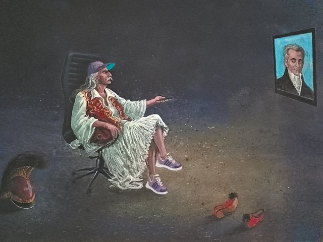 Μια παράξενη έκπληξη με περίμενε τις προάλλες όταν επισκέφθηκα το ατελιέ του εικαστικού Πέτρου Ζουμπουλάκη, που τυγχάνει συγγενής μου. Σε μια γωνιά του στούντιο ο… Θόδωρος Κολοκοτρώνης, ο οποίος, φορώντας αθλητικά παπούτσια στη θέση των τσαρουχιών και καπελάκι τζόκεϊ στη θέση της περικεφαλαίας, καθόταν σε καρέκλα γραφείου με ροδάκια κρατώντας ένα τηλεκοντρόλ. Ο Γέρος του Μωριά κοιτούσε απέναντί του, την οθόνη μιας τηλεόρασης στην οποία βρισκόταν ο… Ιωάννης Καποδίστριας.