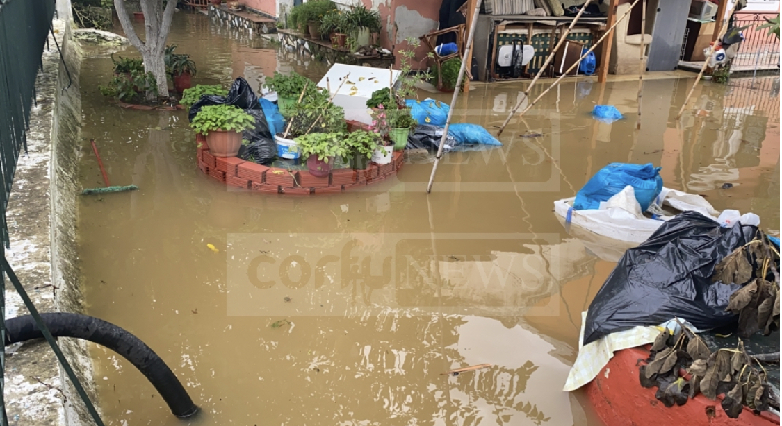 Πλημμύρισαν ξανά σπίτια και δρόμοι στην Κέρκυρα, μετά την πρωινή νεροποντή.