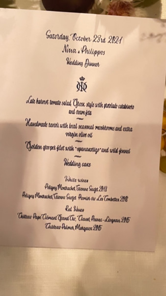 Το μενού που επέλεξε το ζευγάρι για τους καλεσμένους του είχε έντονο το ελληνικό στοιχείο αφού προτεραιότητα του ζευγαριού ήταν καθ’ όλη την διάρκεια των γαμήλιων εκδηλώσεων να αποτυπωθεί ο χαρακτήρας της Αθήνας και της Ελλάδας καθώς επίσης και ο μοναδικός πολιτισμός του τόπου.