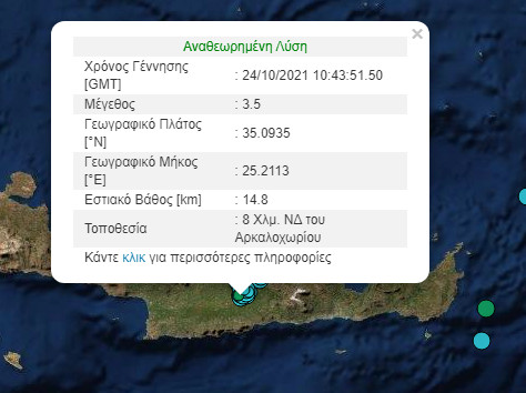 Ο σεισμός των 3,5R σημειώθηκε στις 13:43:51” της Κυριακής (24.10.2021), στην περιοχή που βρίσκεται 8 χιλιόμετρα νοτιοδυτικά του Αρκαλοχωρίου του Δήμου Μινώα Πεδιάδας στο Ηράκλειο Κρήτης.