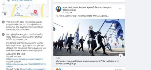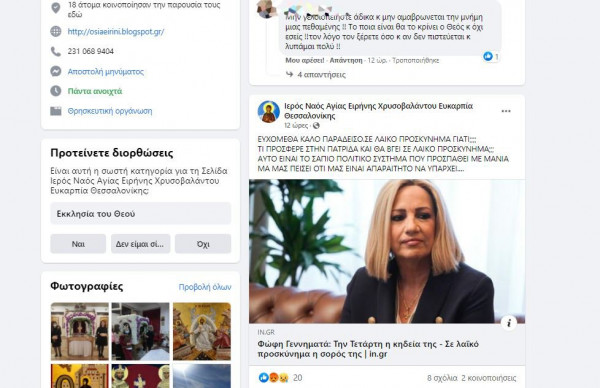 Αλγεινή εντύπωση, αλλά και θύελλα αντιδράσεων, προκάλεσαν αναρτήσεις σχετικά με την Φώφη Γεννηματά σε σελίδα στο Facebook, που φέρεται να ανήκει στον Ιερό Ναό Αγίας Ειρήνης Χρυσοβαλάντου, στην Ευκαρπία Θεσσαλονίκης.