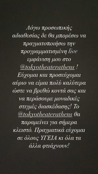 «Λόγω προσωπικής αδιαθεσίας, δεν θα μπορέσω να πραγματοποιήσω την προγραμματισμένη μου Live εμφάνιση στο νυχτερινό κέντρο όπου εμφανίζομαι. Εύχομαι και προσεύχομαι αύριο να είμαι πολύ καλύτερα, ώστε να βρεθώ κοντά σας και να δω και να περάσουμε μοναδικές στιγμές διασκέδασης.»