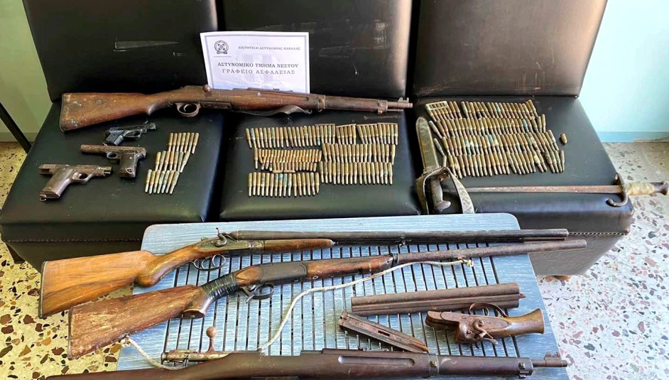 Έπειτα από έρευνα, οι αστυνομικοί κατέσχεσαν μια χειροβομβίδα αμυντικού τύπου, δυο πολεμικά τυφέκια, δυο πιστόλια, τρία κυνηγετικά όπλα, ένα πιστόλι εκτόξευσης φωτοβολίδων, 270 φυσίγγια διαφόρων διαμετρημάτων και δυο ξιφολόγχες.