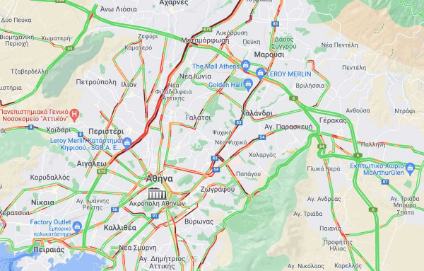 Κίνηση, λόγω και της ώρας, υπάρχει σε όλες σχεδόν τις κεντρικές οδούς του Λεκανοπεδίου, με τον χάρτη να είναι κόκκινος σε πολλά σημεία.