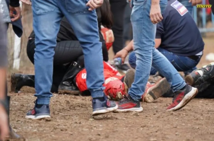 Ο αναβάτης, στη συνέχεια, εκτοξεύτηκε και έπεσε πάνω στον 27χρονο, ο οποίος ετοιμαζόταν να μπει στον αγώνα και δεν είχε προλάβει να βάλει το κράνος του.