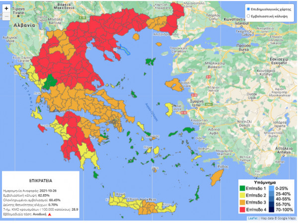 Και αυτό παρόλο που στον επιδημιολογικό χάρτη δεν εμφανίζεται ειδικός χρωματισμός, αλλά ούτε και στοιχεία για τα ποσοστά εμβολιασμού και θετικότητας στην περιοχή.