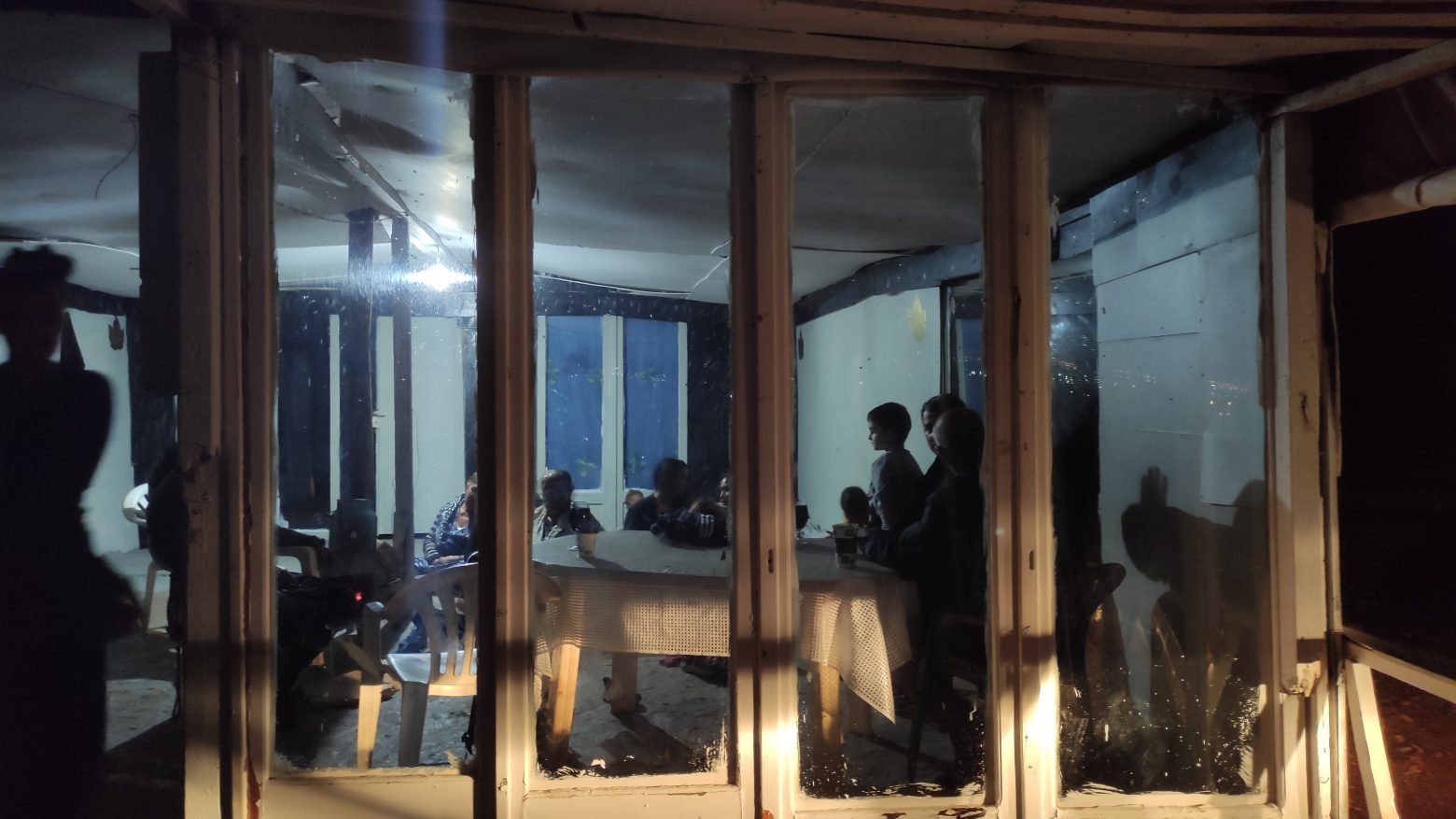 Μια σόμπα φτιαγμένη με λαμαρίνες στη μέση του κτίσματος επιχειρεί να ζεστάνει τουλάχιστον 10 άτομα μέσα σε αυτό. Λίγο μπροστά της ένα κομμάτι από μια σπασμένη καρέκλα η οποία στα επόμενα λεπτά θα πεταχτεί στη φωτιά.