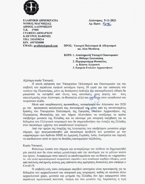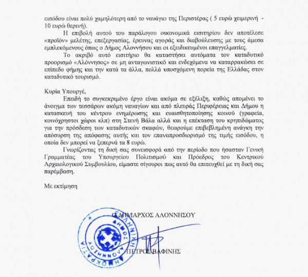 Την έντονη δυσαρέσκεια του στην κοινή απόφαση των Υπουργείων Πολιτισμού και Οικονομικών σχετικά με την επιβολή αντιτίμου 50€ για την επίσκεψη στο ναυάγιο της Περιστέρας, εξέφρασε άμεσα ο Δήμος Αλοννήσου με επίσημη επιστολή του Δημάρχου, Πέτρου Βαφίνη