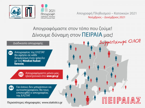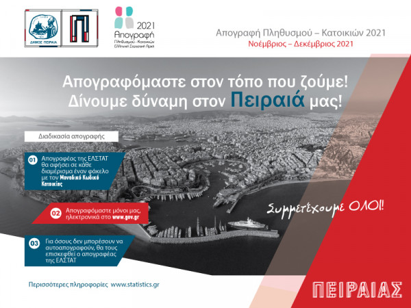 Κάλεσμα σε όλους τους δημότες και τους κατοίκους του Πειραιά, απευθύνει ο Δήμος Πειραιά ώστε να συμμετάσχουν στην προσεχή απογραφή πληθυσμού.