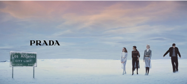 Ο πολυτελής οίκος μόδας άλλαξε το κλίμα στην πρωτεύουσα της ψυχαγωγίας του κόσμου, καλύπτοντάς την με χιόνι και πάγο και στρατολογώντας τέσσερις αστέρες του Χόλιγουντ για να κατοικήσουν στο παγωμένο έδαφος, ενώ έδειχνε κομψά σύνολα Prada «σχεδιασμένα για γιορτή».