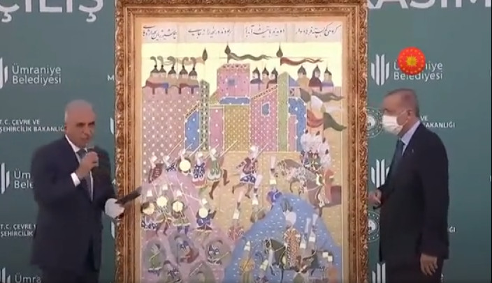 Εκεί, μετά την ομιλία που του απηύθυναν, ο τοπικός δήμαρχος, ο οποίος ανήκει στο κυβερνητικό κόμμα AKP, χάρισε στον τούρκο πρόεδρο πίνακα που αναπαριστά την πολιορκία της Ρόδου από τους Οθωμανούς το 1522, σύμφωνα με τα tourkikanea.