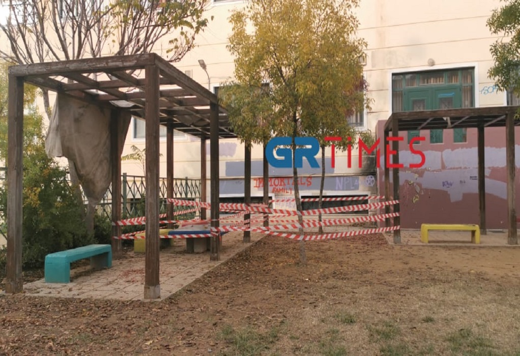 Όπως φαίνεται στο βίντεο και τις φωτογραφίες του GRTimes.gr από το 3ο Πειραματικό Δημοτικό Σχολείο Ευόσμου, το ξύλινο σκέπαστρο έχει αποκλειστεί περιμετρικά με κόκκινες ταινίες, προκειμένου να μη πλησιάζουν τα παιδιά.