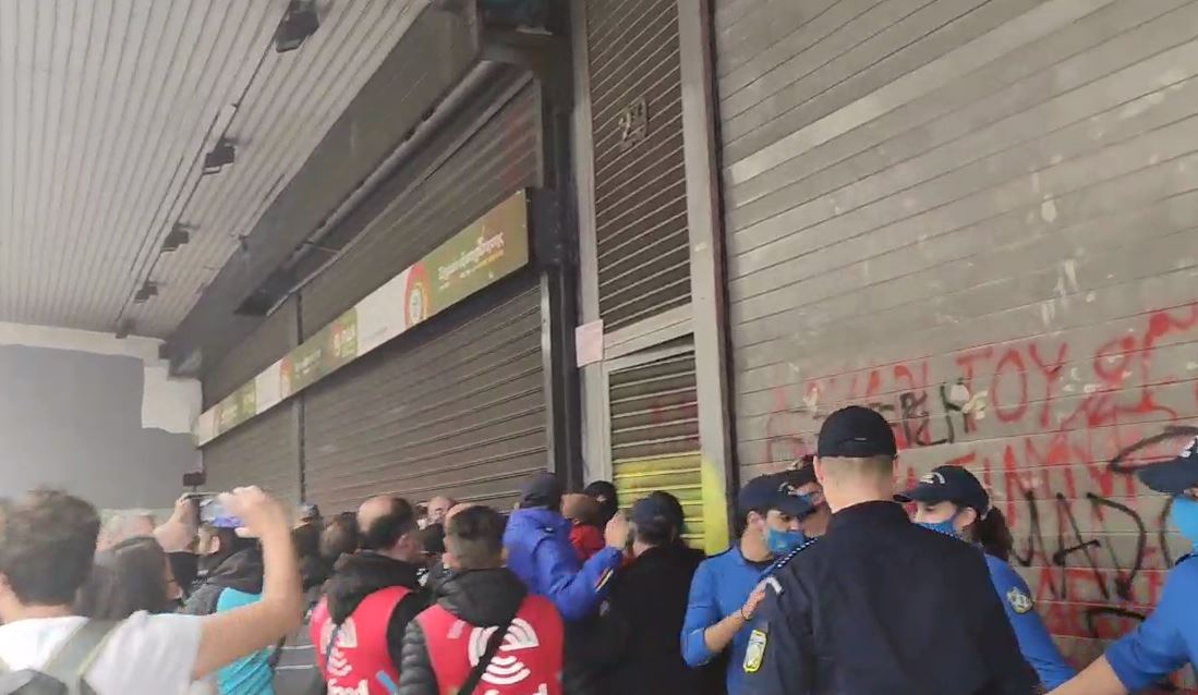 Οι εργαζόμενοι που ζητούσαν να δουν τον υπουργό, με σπρωξίματα, επιχείρησαν να μπουν στο υπουργείο, διαμαρτυρόμενοι επειδή περίμεναν πολλή ώρα.