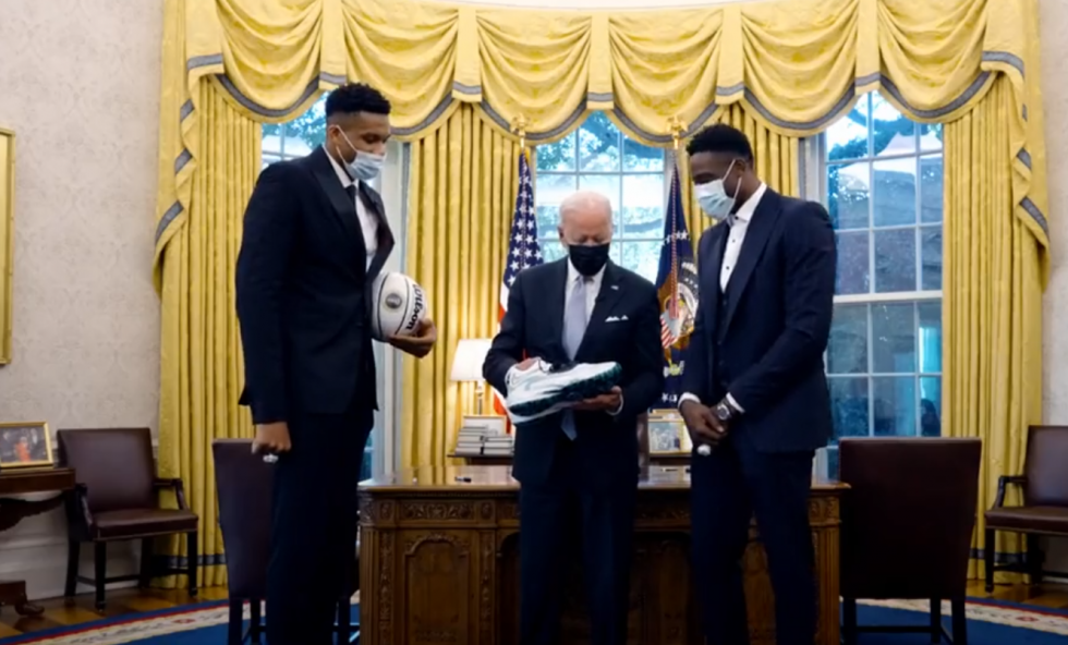 Ο Τζον Μπάιντεν, αφού πήρε τα υπογεγραμμένα παπούτσια από τον Γιάννη και τον Θανάση Αντετοκούνμπο, έγραψε στο twitter: «Ανυπομονώ να πάω μια βόλτα. Ήταν υπέροχο που σας φιλοξενήσαμε».