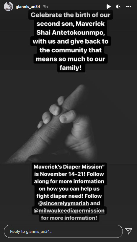 «Γιορτάστε μαζί μας την γέννηση του δεύτερου γιου μας, του Μάβερικ Σάι Αντετοκούνμπο και προσφέρετε στην κοινότητα, που τόση σημασία έχει για την οικογένειά μας. Το Maverick’s Diaper Mission θα γίνει 14-21 Νοέμβρη. Ακολουθήστε μας για περισσότερες πληροφορίες σχετικά με την καταπολέμηση της ανάγκης για πάνες» έγραψε ο Γιάννης Αντετοκούνμπο για το μικρό αδελφάκι του πρωτότοκου, Λίαμ Τσάρλς.