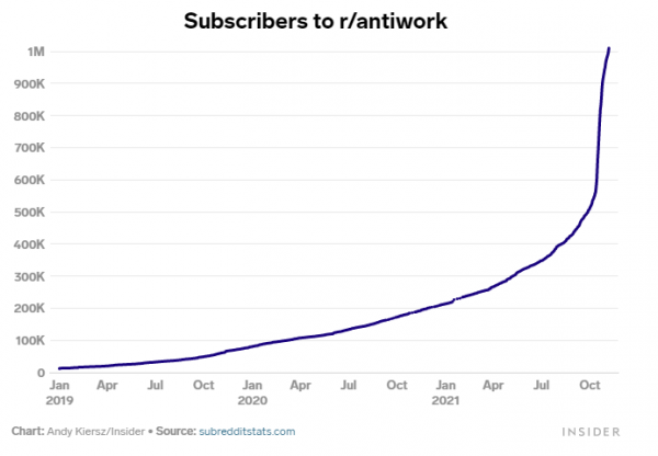 Οι αριθμοί πλέον είναι μεγάλοι και υπολογίσιμοι. Μία ομάδα στο Reddit, το «r/antiwork», έχει προσελκύσει ένα εκατομμύριο followers από το 2013, όταν και ξεκίνησε. Οι μισοί από τους νέους followers μπήκαν στο γκρουπ τον Οκτώβριο. Πρακτικά, δεκάδες χιλιάδες άνθρωποι μπαίνουν στη σελίδα αυτή καθημερινά.