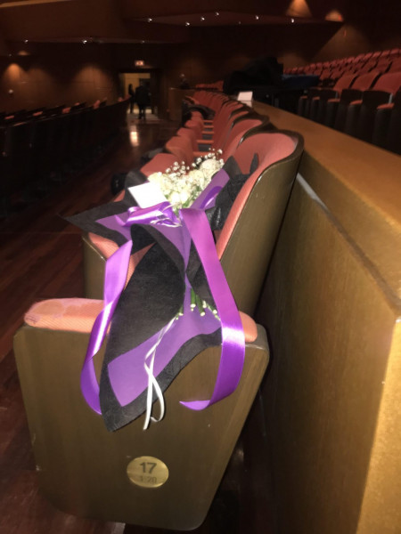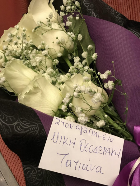 Ιδιαίτερη στιγμή της βραδιάς η ανθοδέσμη που άφησε στην σειρά 17, θέση 1, -όπου συνήθιζε να κάθεται ο Μίκης Θεοδωράκης- με το χειρόγραφο «στον αγαπημένο μου Μίκη Θεοδωράκη, Τατιάνα»