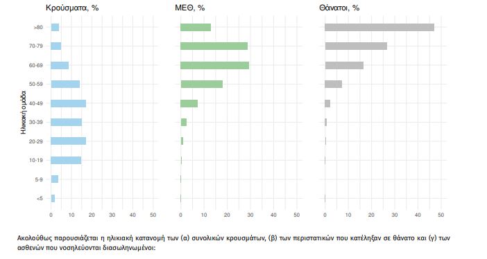 Ηλικιακή Κατανομή κρουσμάτων, νοσηλευόμενων στις MEΘ και ασθενών που απεβίωσαν από την αρχή της πανδημίας
