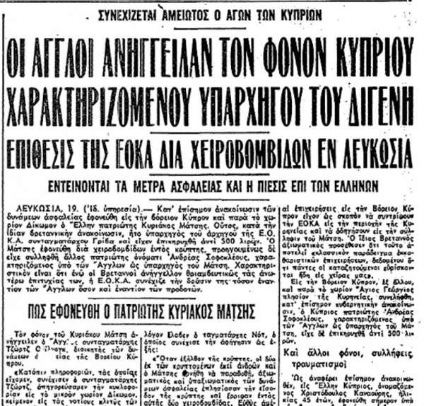 Ο γεωπόνος Κυριάκος Μάτσης, ηγετικό στέλεχος της ΕΟΚΑ του συνταγματάρχη Γεωργίου Γρίβα (Διγενή), είχε επικηρυχθεί από τους Βρετανούς αντί 500 λιρών.