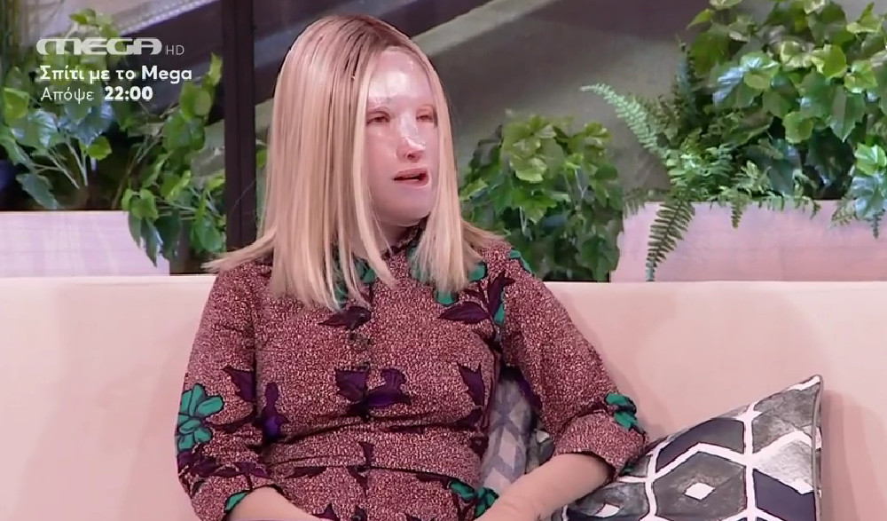 Επίσης, έδειξε τις μάσκες της και τόνισε ότι τις φορά πάντα: «Τη μάσκα τη φοράω συνέχεια. Τη βγάζω μόνο για να φάω και να κάνω μπάνιο. Στο πρόσωπο, στο λαιμό μου και στα χέρια μου είμαι γεμάτη ουλές. Στο σώμα φοράω μια ειδική μπλούζα. Στο μάτι κάνω ειδική περιποίηση γιατί κινδύνεψε».