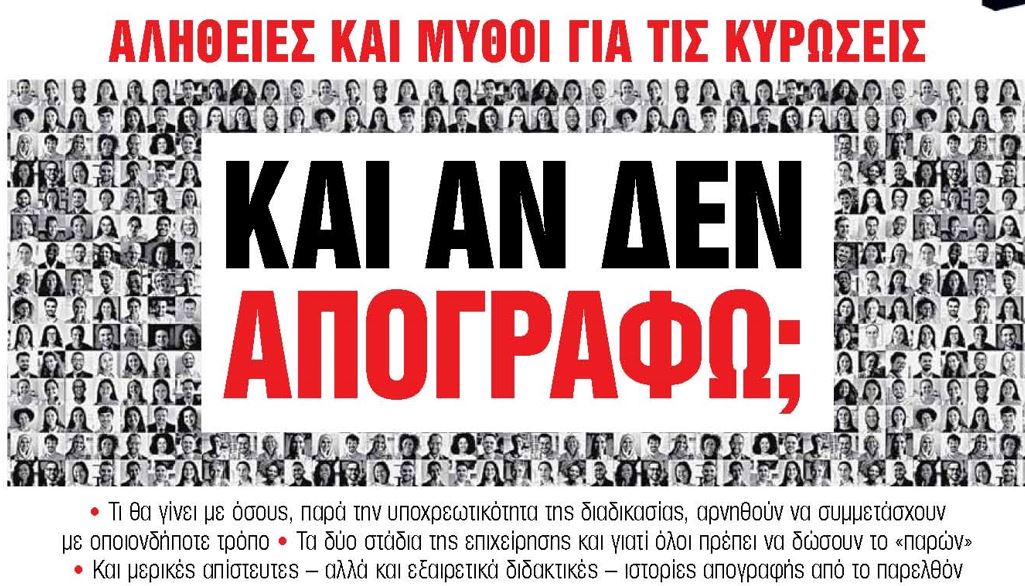 Αλήθειες και μύθοι για τις κυρώσεις - Και αν δεν απογραφώ; • Τι θα γίνει με όσους, παρά την υποχρεωτικότητα της διαδικασίας, αρνηθούν να συμμετάσχουν με οποιονδήποτε τρόπο • Τα δύο στάδια της επιχείρησης και γιατί όλοι πρέπει να δώσουν το «παρών» • Και μερικές απίστευτες – αλλά και εξαιρετικά διδακτικές – ιστορίες απογραφής από το παρελθόν