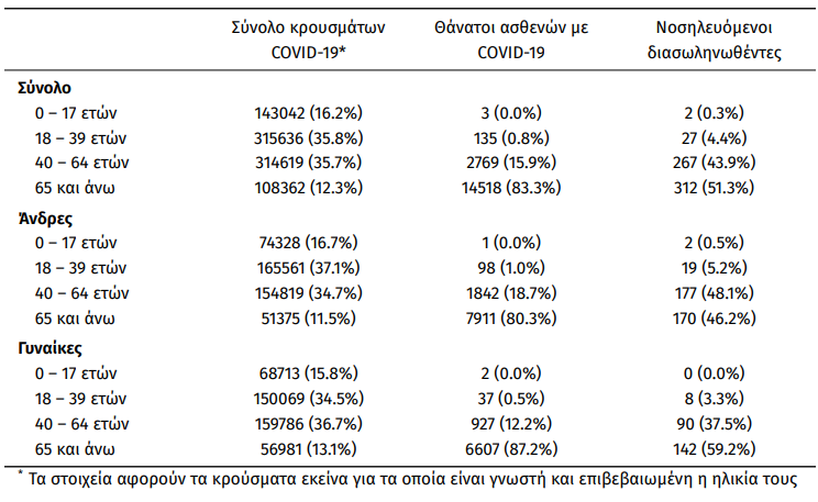 Οι νέοι θάνατοι ασθενών με COVID-19 είναι 105, ενώ από την έναρξη της επιδημίας έχουν καταγραφεί συνολικά 17.425 θάνατοι. Το 95.4% είχε υποκείμενο νόσημα ή/και ηλικία 70 ετών και άνω.