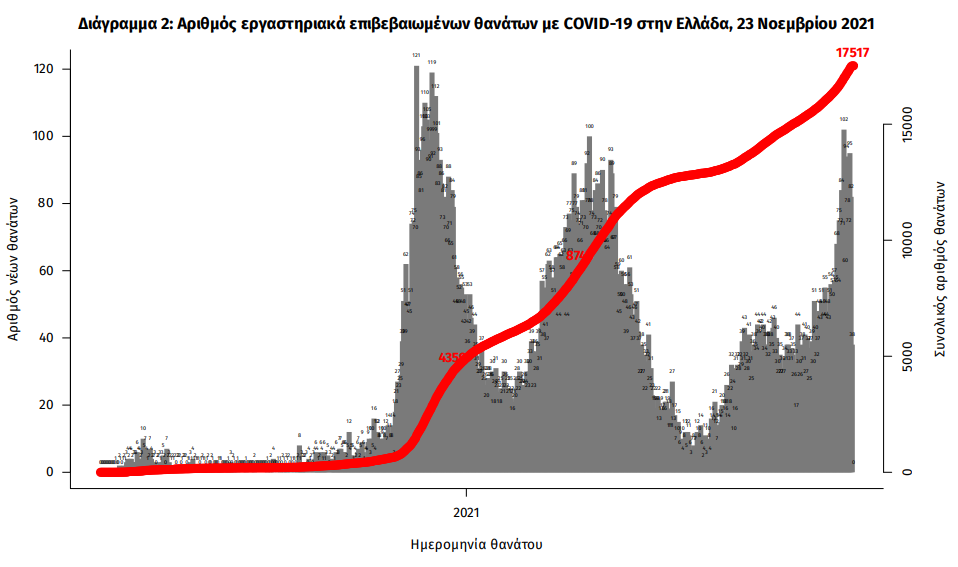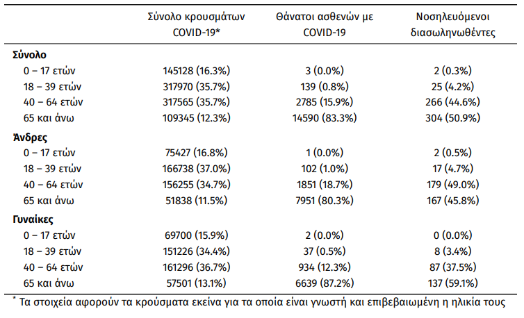 Οι νέοι θάνατοι ασθενών με COVID-19 είναι 91, ενώ από την έναρξη της επιδημίας έχουν καταγραφεί συνολικά 17.517 θάνατοι. Το 95.4% είχε υποκείμενο νόσημα ή/και ηλικία 70 ετών και άνω.