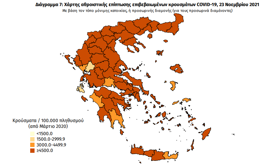 Με βάση τα επιβεβαιωμένα κρούσματα των τελευταίων 7 ημερών, 93 θεωρούνται σχετιζόμενα με ταξίδι από το εξωτερικό και 2.355 είναι σχετιζόμενα με ήδη γνωστό κρούσμα.