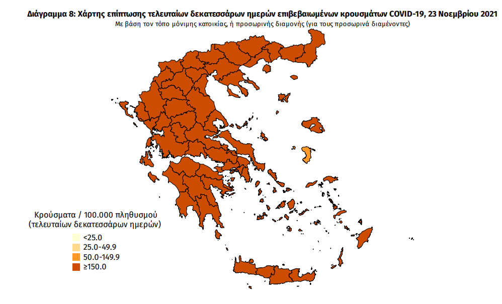 Ο χάρτης αποτυπώνει τη γεωγραφική κατανομή των συνολικών κρουσμάτων COVID-19 (από την αρχή της επιδημίας) ανά Περιφερειακή Ενότητα της χώρας, με βάση την δηλωθείσα διεύθυνση μόνιμης κατοικίας του ασθενούς, ή τη διεύθυνση προσωρινής διαμονής για τους τουρίστες και άλλους προσωρινά διαμένοντες στην Ελλάδα. Συμπεριλαμβάνονται τόσο κρούσματα με ιστορικό ταξιδίου (“εισαγόμενα”) όσο και κρούσματα με πιθανή εγχώρια μετάδοση.
