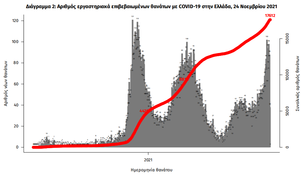 Οι νέοι θάνατοι ασθενών με COVID-19 είναι 93, ενώ από την έναρξη της επιδημίας έχουν καταγραφεί συνολικά 17.612 θάνατοι. Το 95.4% είχε υποκείμενο νόσημα ή/και ηλικία 70 ετών και άνω.