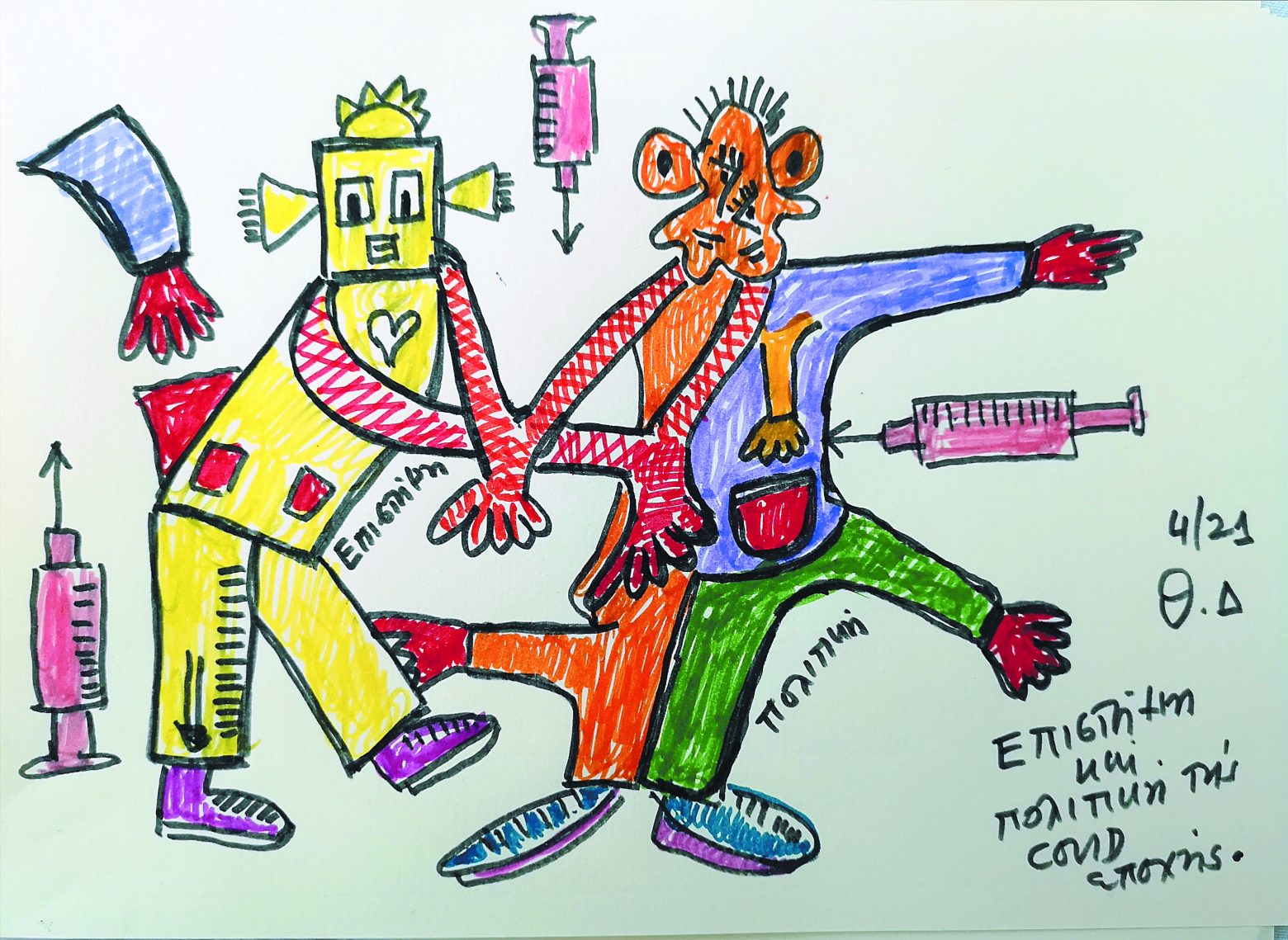 Τα κείμενα και τα εικαστικά στο πόνημα του γιατρού Θανάση Δρίτσα δεν εστιάζουν στις επιστημονικές διαμάχες και στα διλήμματα σχετικά με τη διαχείριση της πανδημίας, αλλά στον Ανθρωπο μέσα στη δίνη που αυτή προκάλεσε και συνεχίζει να προκαλεί