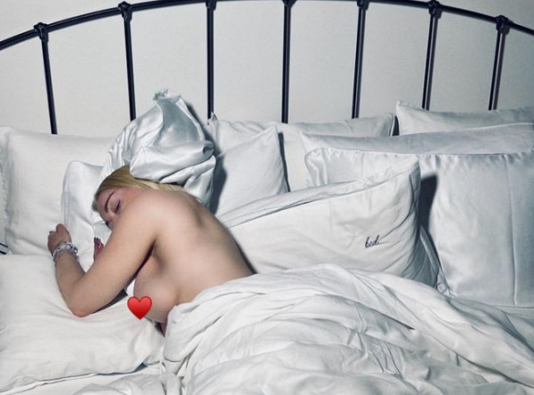 Σε αυτή ποζάρει ημίγυμνη στο δωμάτιό της, με ψηλοτάκουνες πανάκριβες γόβες και δικτυωτό καλσόν, ενώ προτάσσει το στήθος και τα οπίσθιά της.