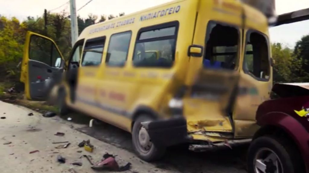 Ενδεικτικά της σφοδρής σύγκρουσης, είναι τα συντρίμμια και των δυο οχημάτων στην άσφαλτο, ενώ οι ζώνες ασφαλείας προφύλαξαν τους μικρούς μαθητές.