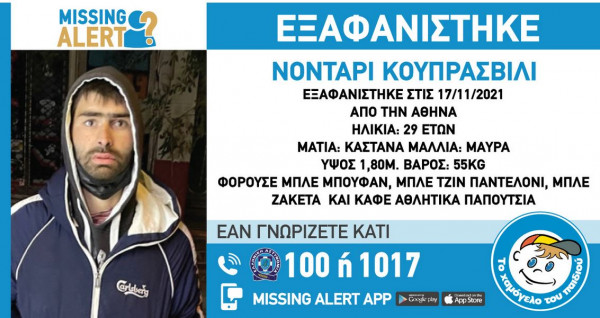 Συναγερμός έχει σημάνει στις Αρχές για την εξαφάνιση του Νοντάρι Κουπραασβίλι από την περιοχή της Αθήνας. Πρόκειται για έναν 29χρονο που αγνοείται από την Τετάρτη 17 Νοεμβρίου, και τώρα το Χαμόγελο του Παιδιού προχωρά στη δημοσιοποίηση των στοιχείων του.